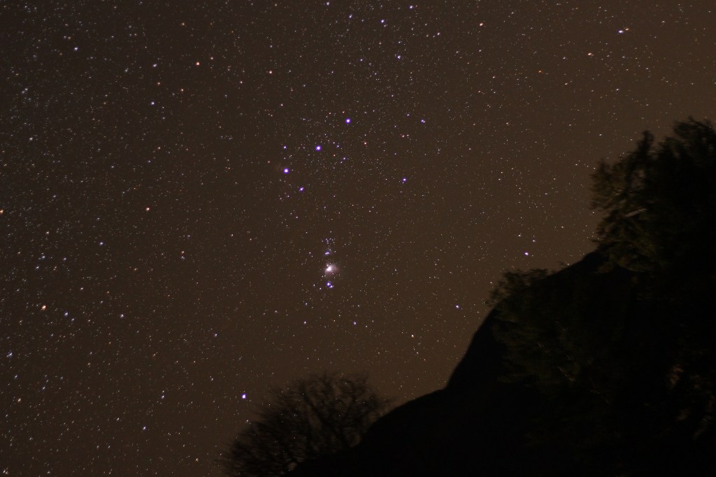 And winter clouds did dissipate one late season night – not quite freezing cold…just long enough to grab a shot of Orion as it set behind the New York mountains.