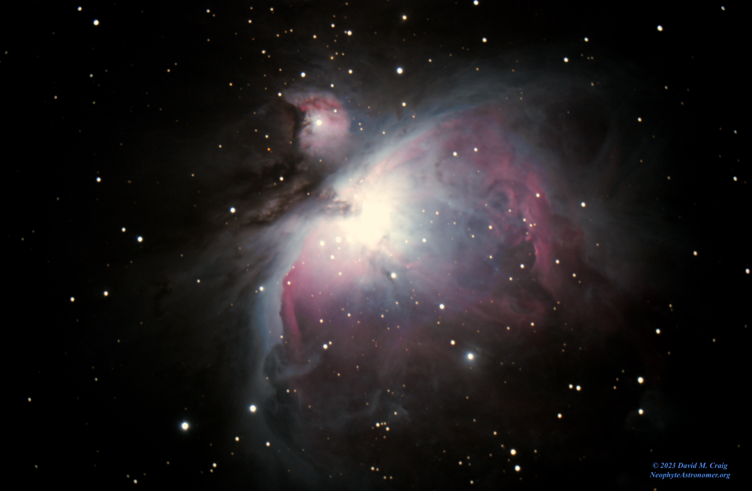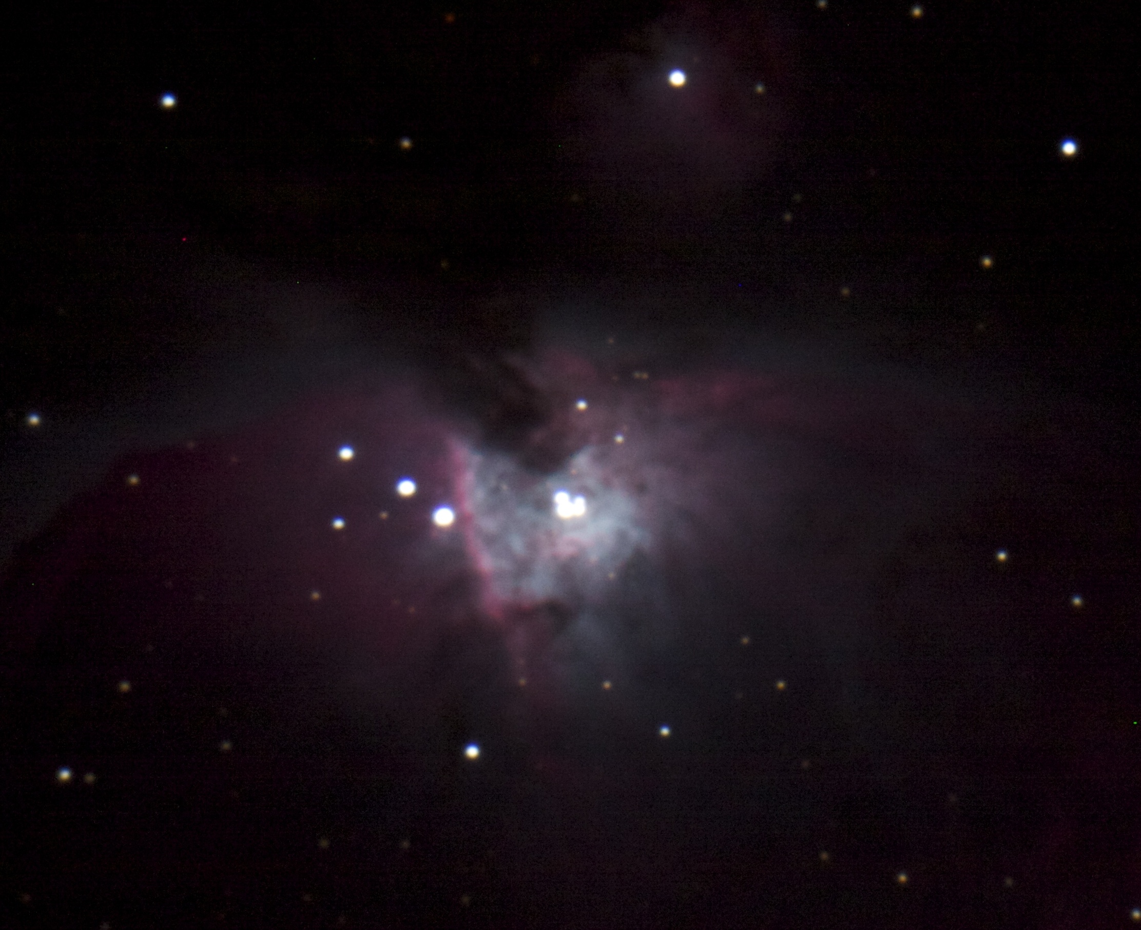 The bright central star mass is “blown out” in order to bring out details in the nebulous gasses. The bright stars are way brighter than the gasses! Oh well, maybe some day I’ll get a camera with more dynamic range!