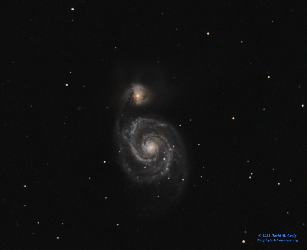 But this wouldn’t be the first time I forgot to remove it after focusing! Returning the telescope to M51 yielded a muted picture of the galaxy that didn’t look too bad at first. But I neglected to realize for the first five exposures that it wasn’t quite right, as I was still shooting through the mask! Oh well! I had to toss those exposures, but I took 26 more of the three-minute shots @ 1600 ISO through my DSLR camera: