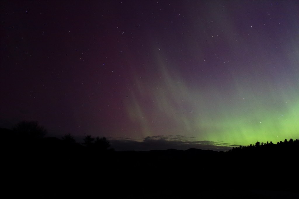 Everything had to come together – little to no moonlight, clear skies, high geomagnetic activity, and a flare spewing intensely charged particles directly towards earth. Our sky had been overcast for most of the day. But luck was with us this time as the clouds lifted by about 10:30 PM local time. I headed out to Norton Cemetery in Keene with my camera and tripod, and stayed out until about 1 AM. I’d have stayed longer but I did have to get out of bed before noon on Saturday!
